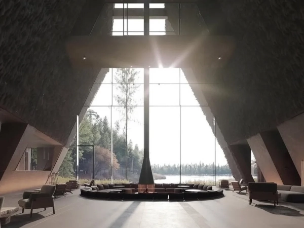 Сердце курорта «Ладожские шхеры» — лобби с панорамным остеклением. Рендер предоставлен пресс-службой корпорации Туризм.РФ